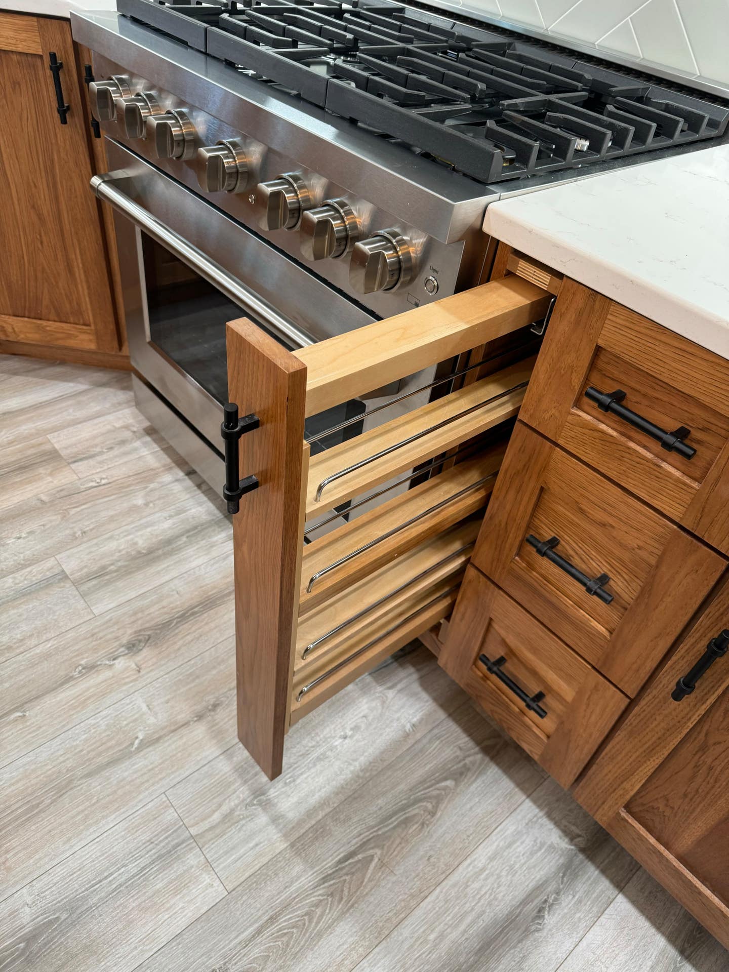 “While we were in the racing, I got into metal fabrication and built a lot of roll chassis. After we quit racing, I still wanted to work with metal and decided to integrate that into the cabinet side of things. I make panel inserts for cabinet doors. It’s worked out well, and we’ve started selling them nationwide.”